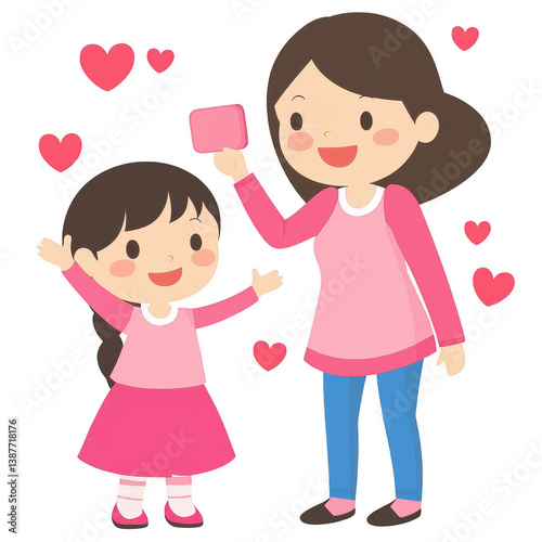 A joyful illustration of a mother and daughter bonding, both in pink outfits, surrounded by hearts, symbolizing love and happiness.