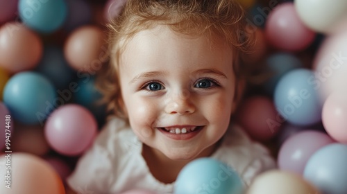 A joyful infant grins widely while nestled comfortably among a collection of colorful play balls, capturing the charm and innocence of early childhood.