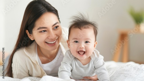 A joyful mother and baby share a tender moment, with the baby smiling widely while lying on a soft blanket in a bright, cozy environment.