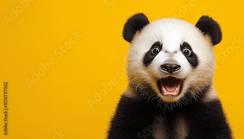 A joyful panda with a bright yellow background, showcasing its playful nature and charming expression. Ideal for wildlife enthusiasts.