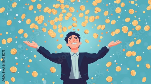 A joyful person in a suit stands with arms outstretched, surrounded by falling coins, symbolizing wealth and success.