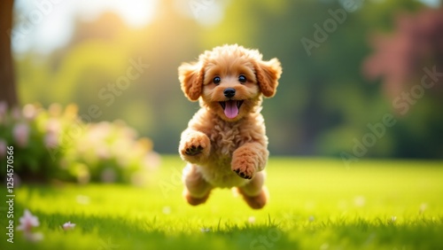 A joyful Toy Poodle puppy leaps into the air in a sunlit park, its curly apricot fur bouncing. Its sparkling eyes and playful energy create a perfect, vibrant moment.