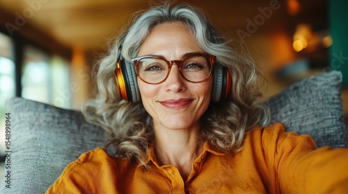 A joyful woman in a cozy living space enjoys her favorite music with stylish headphones, showcasing her relaxed demeanor and stylish glasses amidst a warm atmosphere.