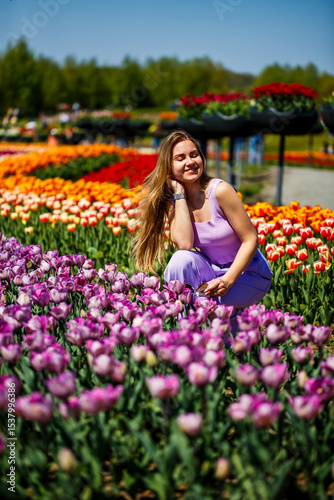 A Joyful Woman Surrounded by Numerous Vibrant Tulips in Full Bloom A Wonderful Celebration of Spring Colors and the Splendor of Natures Beauty, Bringing Cheer and Happiness to All