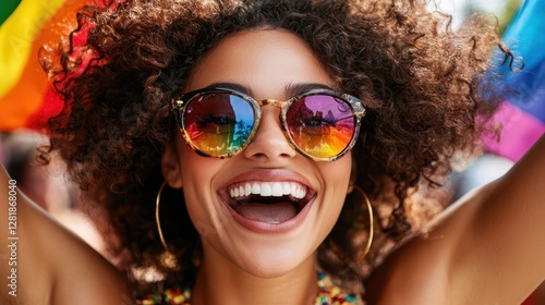woman, celebration, pride, joy, vibrant, rainbow, sunglasses, smile, event, joyful, happiness, laughter, freedom, diversity, emotion, festival, culture, colours, artistic, spirited, positivity, community, beauty, bright, empowerment, fun, togetherness, elation, oneness, catchy, connection, creativity, love, expressive, parade, colourful, energetic, festive, narrative