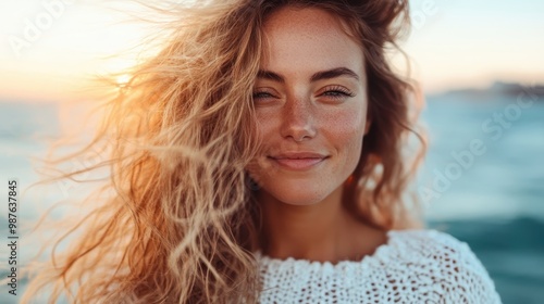 woman, blonde hair, freckled, sunset, ocean, joyful, beach, breeze, happiness, freedom, spontaneous, nature, cheerful, smile, relaxing, scenic, warmth, glow, carefree, linen, playful, colourful, ambience, outdoors, radiant, coastal, sunlight, gleeful, sand, mindfulness, stability, serene, casual attire, peaceful, harmony, contemporary, vitality
