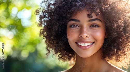joyful, woman, curly, hair, smile, brightly, natural, set, facial, portrait, beauty, cheerful, fresh, warmth, person, glow, grace, daylight, health, background, clothing, garden, peace, playful, closeup, bliss, sunlight, freedom