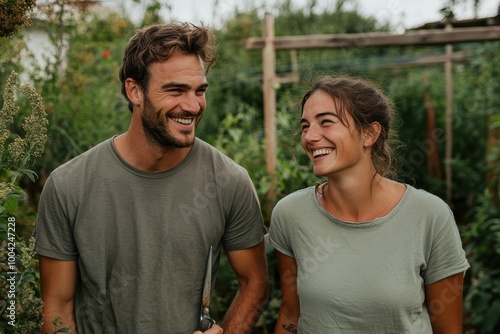 gardener, nature, greenery, couple, joy, casual attire, harmony, fulfillment, green, garden, lush, young, life, smile, outdoors, plant, simplicity, lifestyle, natural, foliage, environment, serenity, leisure, relaxation, modern, organic, bountiful, rendering, friendly, wholesome, eco, interaction, engagement, connection, growth, germinating, dirtied, earth, garden tool, exploration