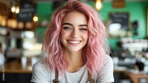A joyful young woman with vibrant pink hair smiles brightly in a cozy cafe, radiating warmth and positivity, creating a lively and inviting atmosphere.