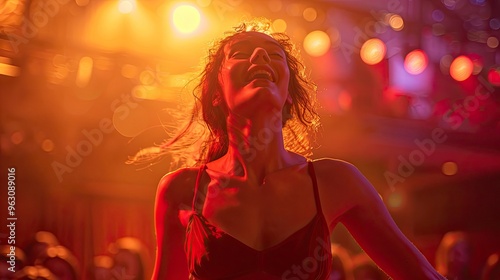 A jubilant dancer performing on stage, receiving a standing ovation from the audience