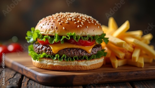 hamburger, fries, food photography, lettuce, tomatoes, delicious, appetising, cheese, sesame seeds, burger