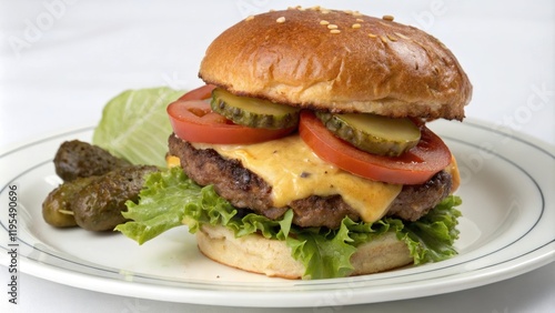 A juicy double beef burger with melted cheese and crisp lettuce leaves placed on a clean white plate, savory meals, mealtime food, beef burgers