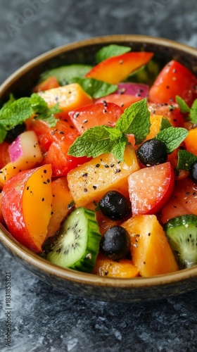 A juicy fruit salad with berries, kiwi and mint adorns the table, serving as an appetising backdrop for culinary articles or restaurant menus.