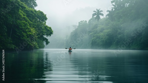A kayaker paddles through tranquil waters surrounded by lush green tropical forest in a misty, serene atmosphere