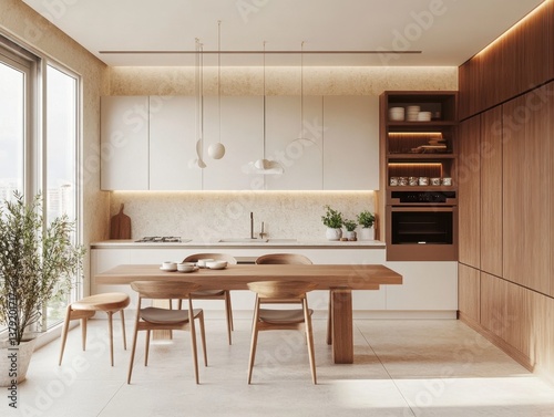 kitchen, wooden, table, chair, potted, plant, vase, well, modern, design, white, interior, house, home, architecture, decor, window, furniture, wood, room, estate, space, luxury, light, real, nobody, indoor, floor, oven, apartment, copy, inside, living, residential, concept, empty, style, wall, lamp, clean, signs, blur, minimalistic, sink, blurry, homeowner, purchase, grass, key
