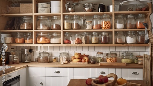kitchen, wooden, storage, drawer, utensil, jar, pan, plate, wood, shelf, interior, furniture, cupboard, design, generative, ai