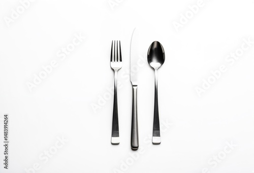 A knife, fork and spoon on a white surface.