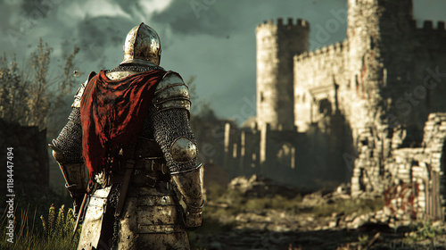 A knight stands in front of a ruined castle, his armor battered and worn. The moonlight casts long shadows as he surveys the destruction around him, reflecting on the past.