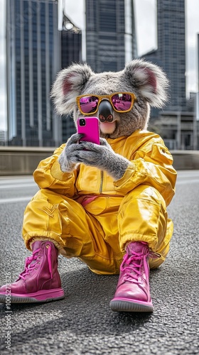 A koala wearing sunglasses, yellow jumpsuit and pink sneakers, sits on the street in the city, looking at a smartphone.