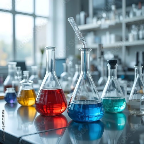 A laboratory setup with colorful chemical solutions in glassware academic lab
