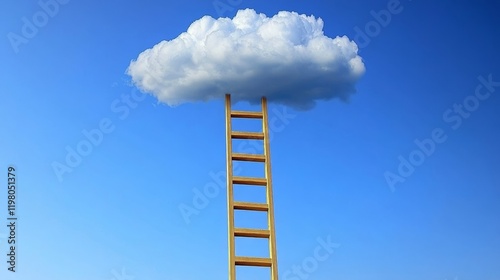 A ladder made of wood stretching up towards a bright blue sky, piercing through fluffy white clouds