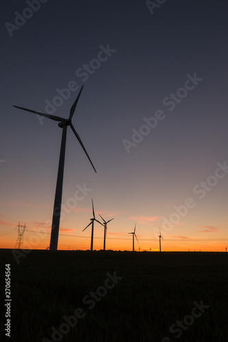 A landscape with windmills in a wind farm at sunset.