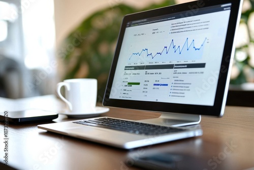 laptop, computer, open, screen, displaying, graph, cup, business, sitting, desk, hot drink, technology, chart, financial, office, report, table, finance, concept, workplace, marketing, analysis, diagram, digital, datum, information, work, desktop, stock, growth, success, communication, investment, background, notebook, money, accounting, statistic, cyberspace, device, modern, forex, economy, monitor, businessman, graphic, mobile, interior