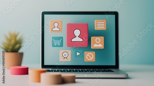 A laptop displaying various user interface icons, emphasizing digital interaction and profile management in a modern workspace.