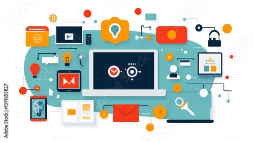 A laptop displays a digital workflow process surrounded by various icons representing communication, ideas, security, and online services.