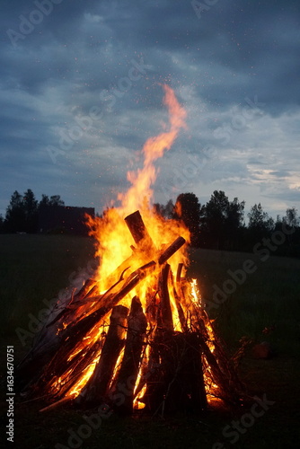 A large bonfire burns on Midsummer Eve in Latvia. Bright bonfire flame on the rural field at evening