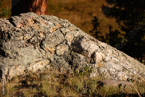 A large boulder, with a ponderosa pine in the background, sits weathered in the morning sunshine within Moraine Park, Rocky Mountain National Park, Colorado in early September