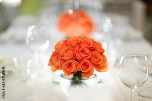 a large bouquet of red roses Looks outstanding in a glass vase in the center of the dining table. For guests waiting to sit and eat There were wine glasses and plates around.