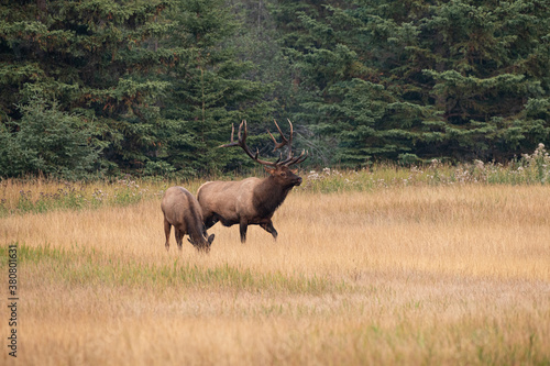 A large bull elk standing beside one of his cows