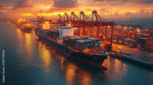 A large cargo ship is docked at a busy logistics port during a vibrant sunset. Cranes are actively unloading containers while the water reflects the colorful sky.