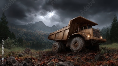 dump truck, mining, truck, heavy, vehicle, industrial, forest, muddy, terrain, autumn, construction, transport, mountain, hill, machinery, dirt, rugged, climate, stormy, overcast, engineering, wheel, powerful, equipment, forested, worksite, landscape, cloudy, thunder, nature, remote, large, rural, hauling, dangerous, wilderness