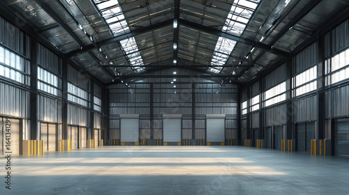 A large, empty industrial warehouse with high ceilings and large windows. The space is devoid of any furniture or equipment, and the lighting is bright and natural.