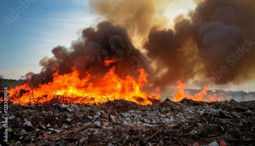 fire, landfill, smoke, flames, pollution, burning, waste, garbage, destruction, environment, blaze, debris, heat, toxic, hazard, disaster, inferno, emergency, air pollution, ash, smog, danger, crisis, ecology, wildfire, emission, trash, combustion, devastation, global warming