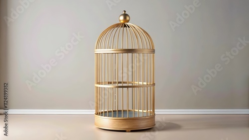 gold, cage, wood, footed, bar, metal, empty, interior, room, home, decor, design, structure, decorative, vintage, antique, ornate, round, tall, open, freestanding, light, shadow, floor, wall, brown, beige, white, grey, minimalist, simple, elegant, clean, polished, shiny, solitude, confinement, freedom, hope