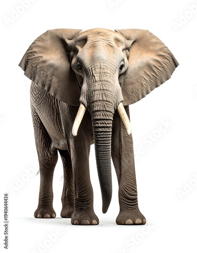 elephant, mammal, grey, big, ear, tusk, animal, wild, nature, wildlife, conservation, trunk, large, standing, white, background, isolated, 1, adult, full body, view, front, facing, camera, calm, peaceful, gentle, giant, wrinkled, skin, rough, texture, strong, powerful, majestic, impressive, serene, quite, beautiful, detailed, realistic, photo, studio, shot, no, people, outdoors, scene