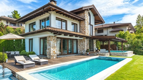 large, house, pool, patio, furniture, backyard, swimming, outdoors, architecture, summer, luxury, modern, blue, building, exterior, home, ownership, vacation, design, wood, material, poolside, holiday maker, resort, relaxation, lifestyle, tropical, climate, travel, destination, grass, water, back, yard, residential, district, nature, holiday, villa, formal, garden, roof, no people, chair, green, colours, day, window