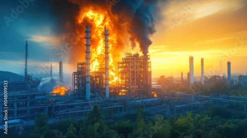 large, industrial, facility, hydrogen, ammonia, production, ablaze, during, sunset, emitting, thick, smoke, flames, into, evening, sky, highlighting, dangerous, situation, plant, fire, urban, area, zone, chemical, refinery, emergency, response, evacuation, safety, pollution, hazardous, material, infrastructure, manufacturing, energy, accident, environmental, impact, oil, gas, processing