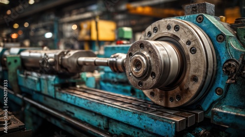 A large industrial lathe machine in a workshop setting. The machine is in use, with a metal workpiece being processed. The background features various industrial machinery and equipment.