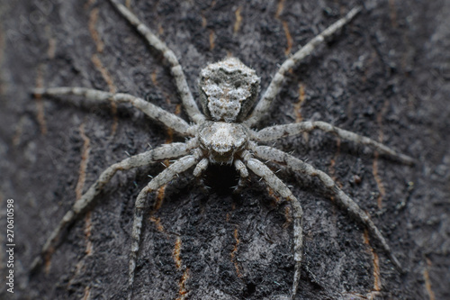 A large long-legged spider clung to the bark of a tree. Macro, selective focus