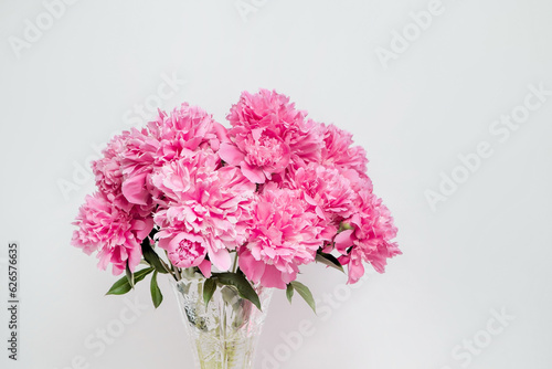 A large lush bouquet of pink peonies in a vase on a white wall background