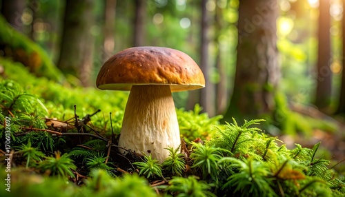 mushroom, forest, moss, nature, sunlight, green, tree, wood, wild, growth, fungal, flora, boletus, autumn, forest floor, tranquil, sharpened, detail, closeup, macro, bright, healthy, life, landscape, fresh, edible