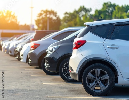 A large parking lot with many vehicles neatly arranged.