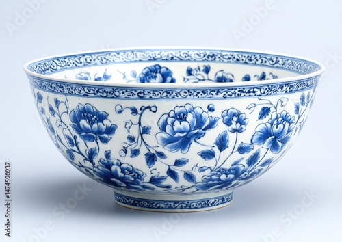 A large porcelain bowl, featuring a blue and white floral design of peonies and foliage, sits on a light blue background