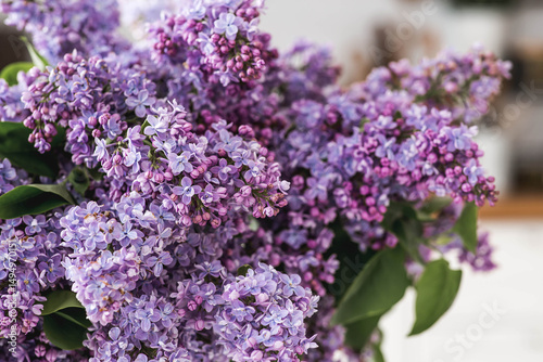 A large purple bouquet of lilacs on the table. In the background is the interior of a modern white Scandinavian-style kitchen. The concept of home comfort and celebration.