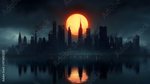 A large, red moon hangs over a cityscape with the moon's reflection shining in the water.