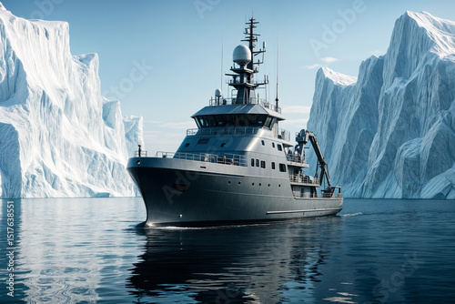 A large research vessel navigates through icy waters surrounded by towering icebergs under a clear blue sky.